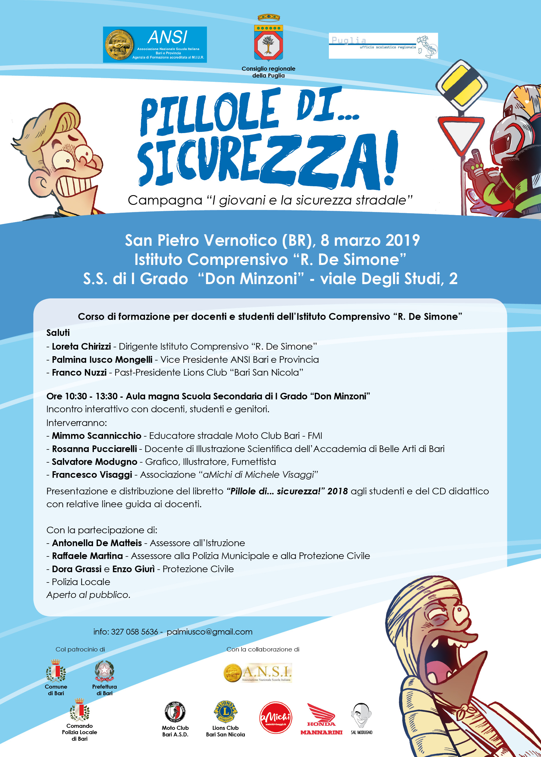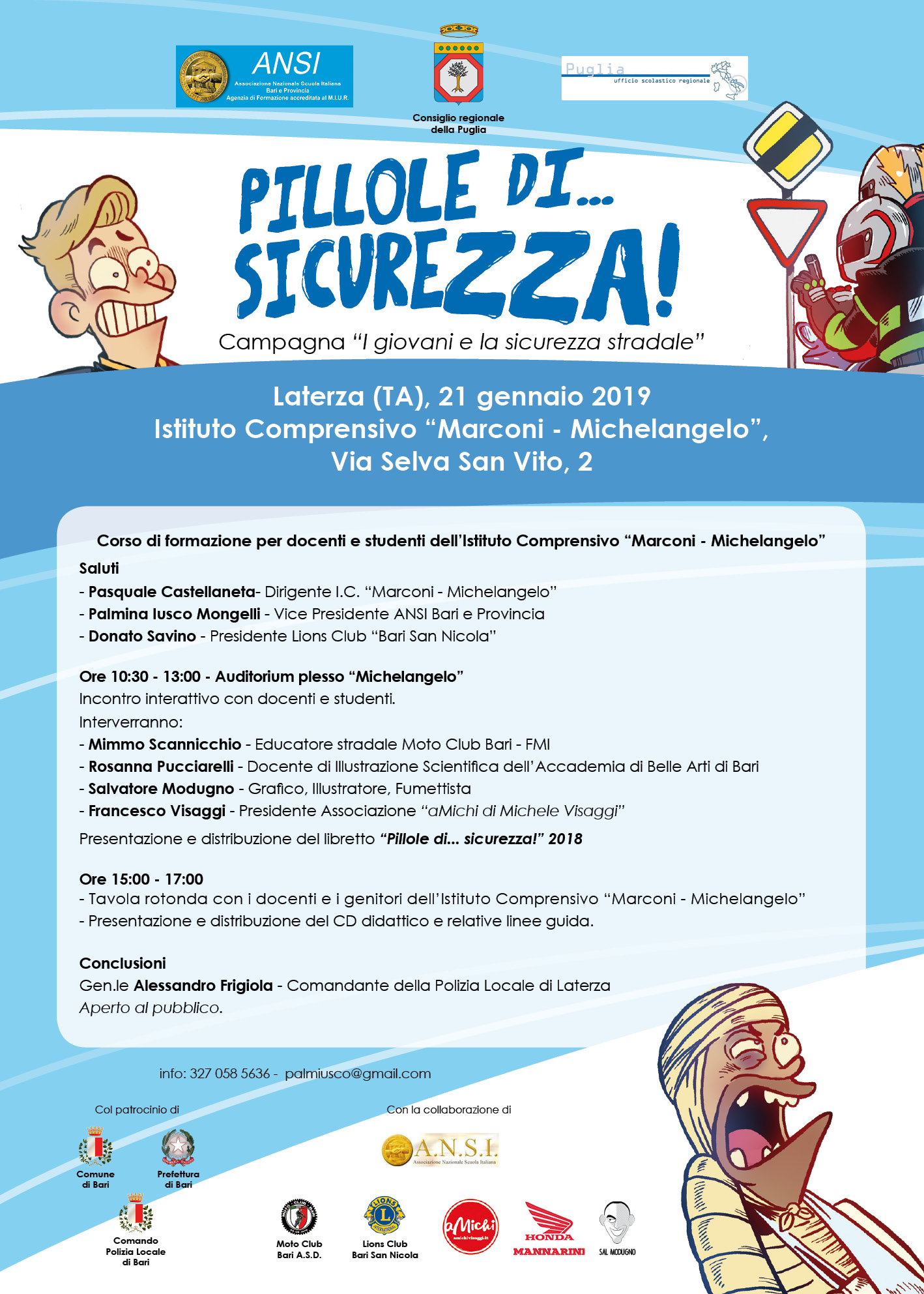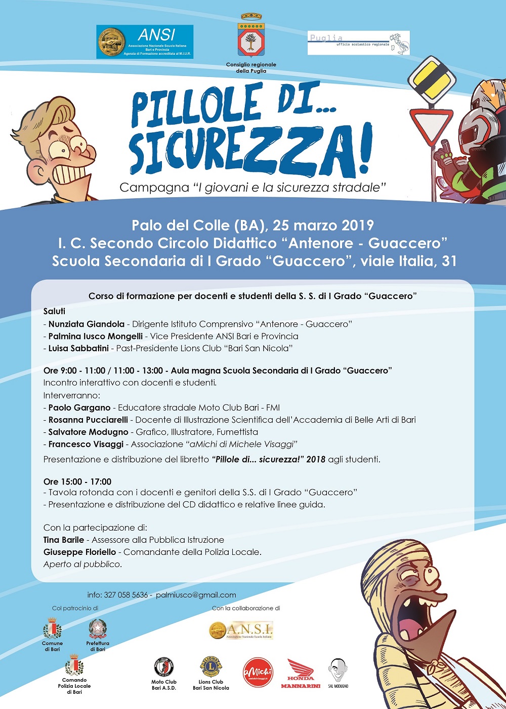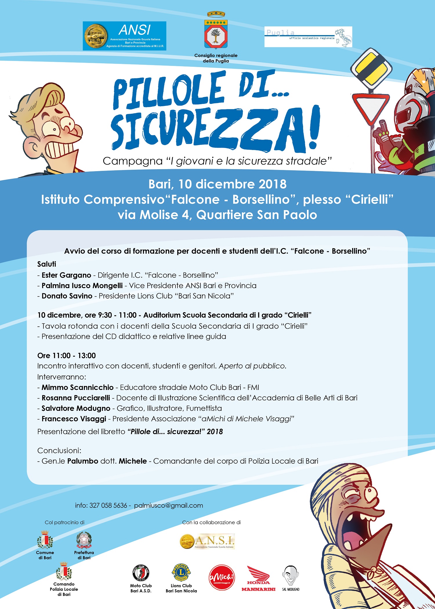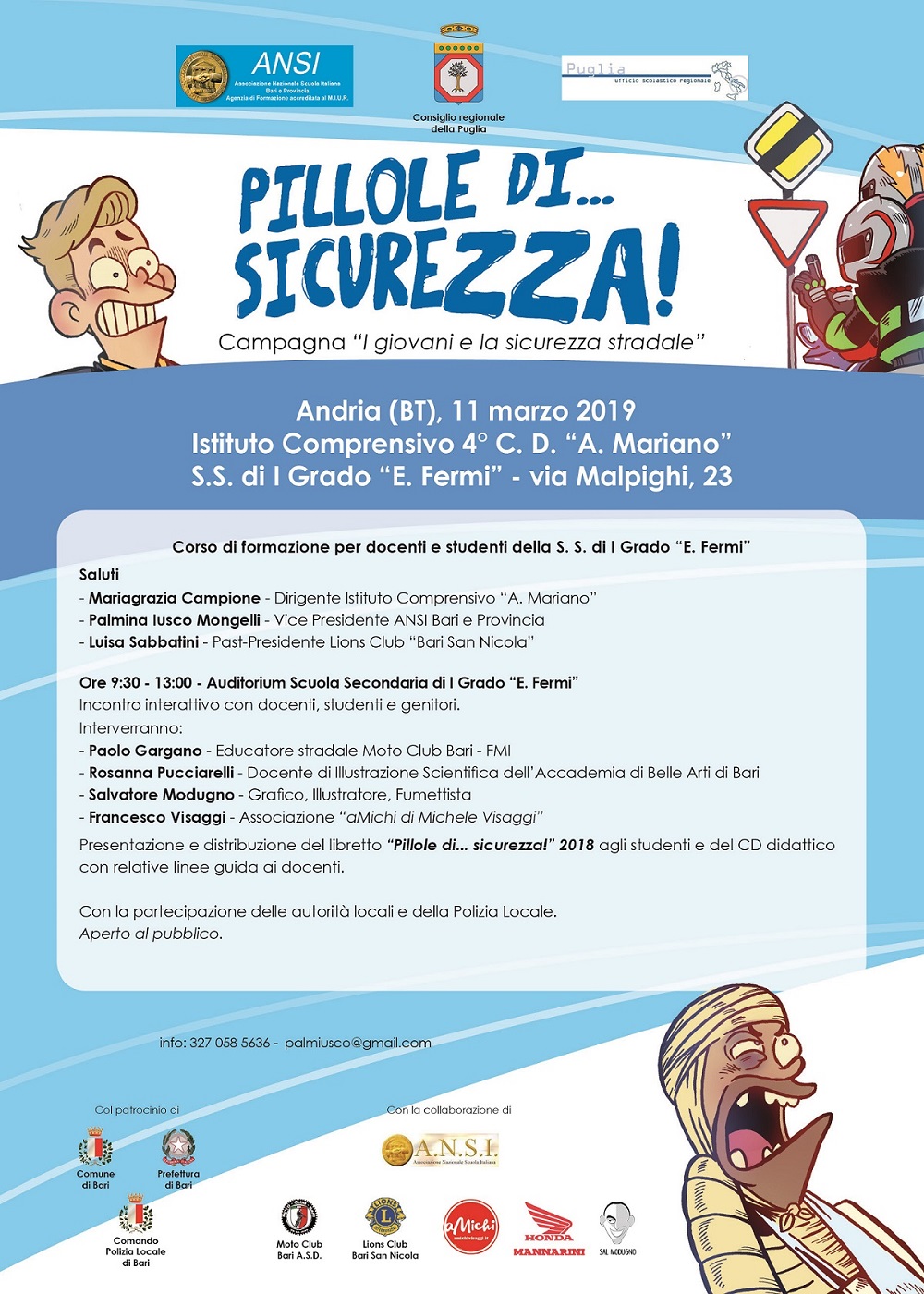 Il Consiglio Regionale della Puglia – Sezione Biblioteca e Comunicazione Istituzionale, accogliendo l’obiettivo lanciato dall’ONU di dimezzare la mortalità stradale entro il 2020, sostiene e promuove il progetto “Pillole di… Sicurezza! Educazione alla sicurezza stradale”, organizzato dall’ANSI-Bari e dall'Ufficio Scolastico Regionale della Puglia, in collaborazione con la Cattedra di Illustrazione scientifica dell’Accademia di Belle Arti di Bari, il Moto Club Bari A.S.D., l’Associazione aMichi di Michele Visaggi, il club Lions Bari San Nicola, il fumettista, illustratore scientifico Salvatore Modugno e il patrocinio del Comune di Bari, della Prefettura di Bari, del Comando della Polizia.
