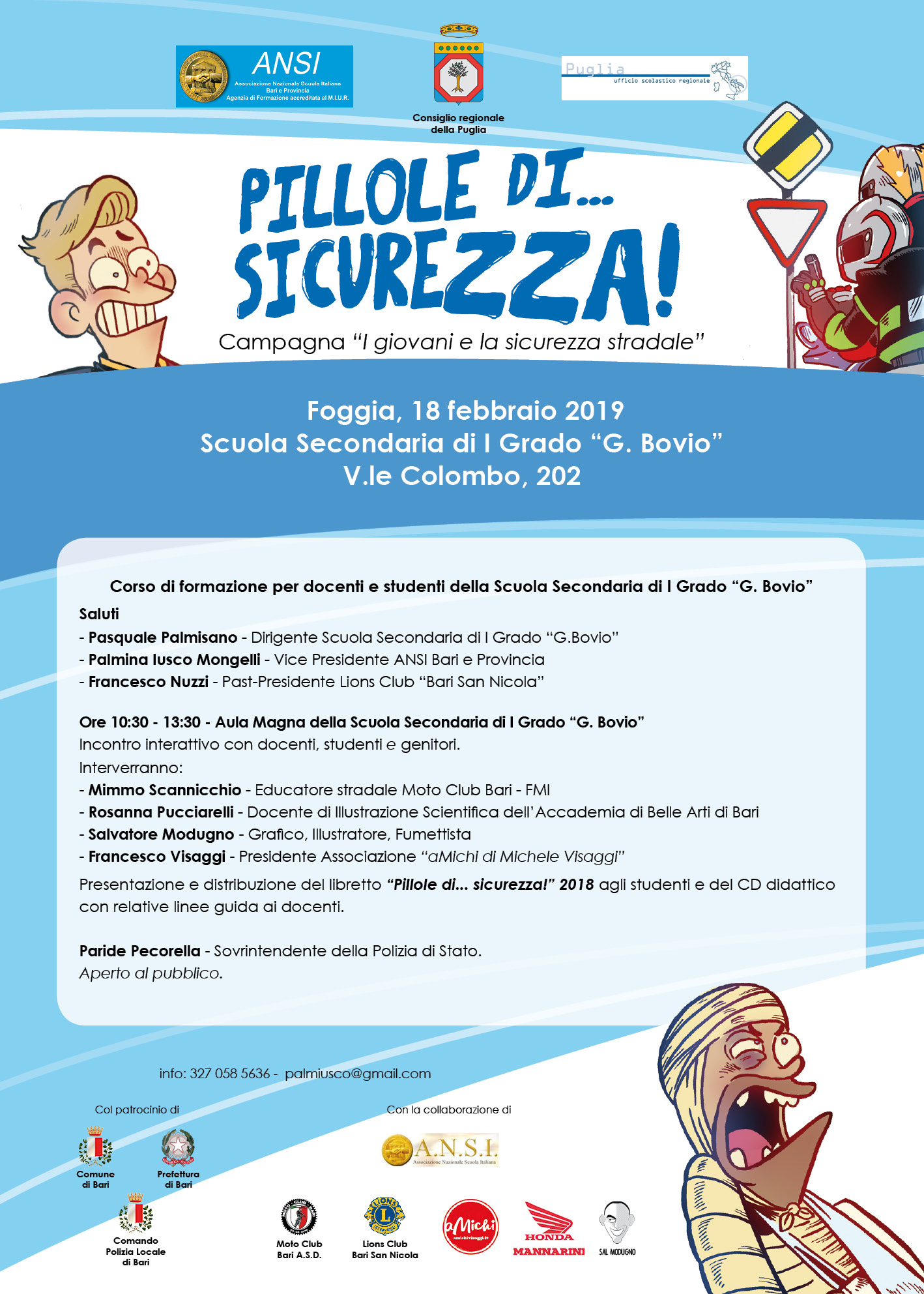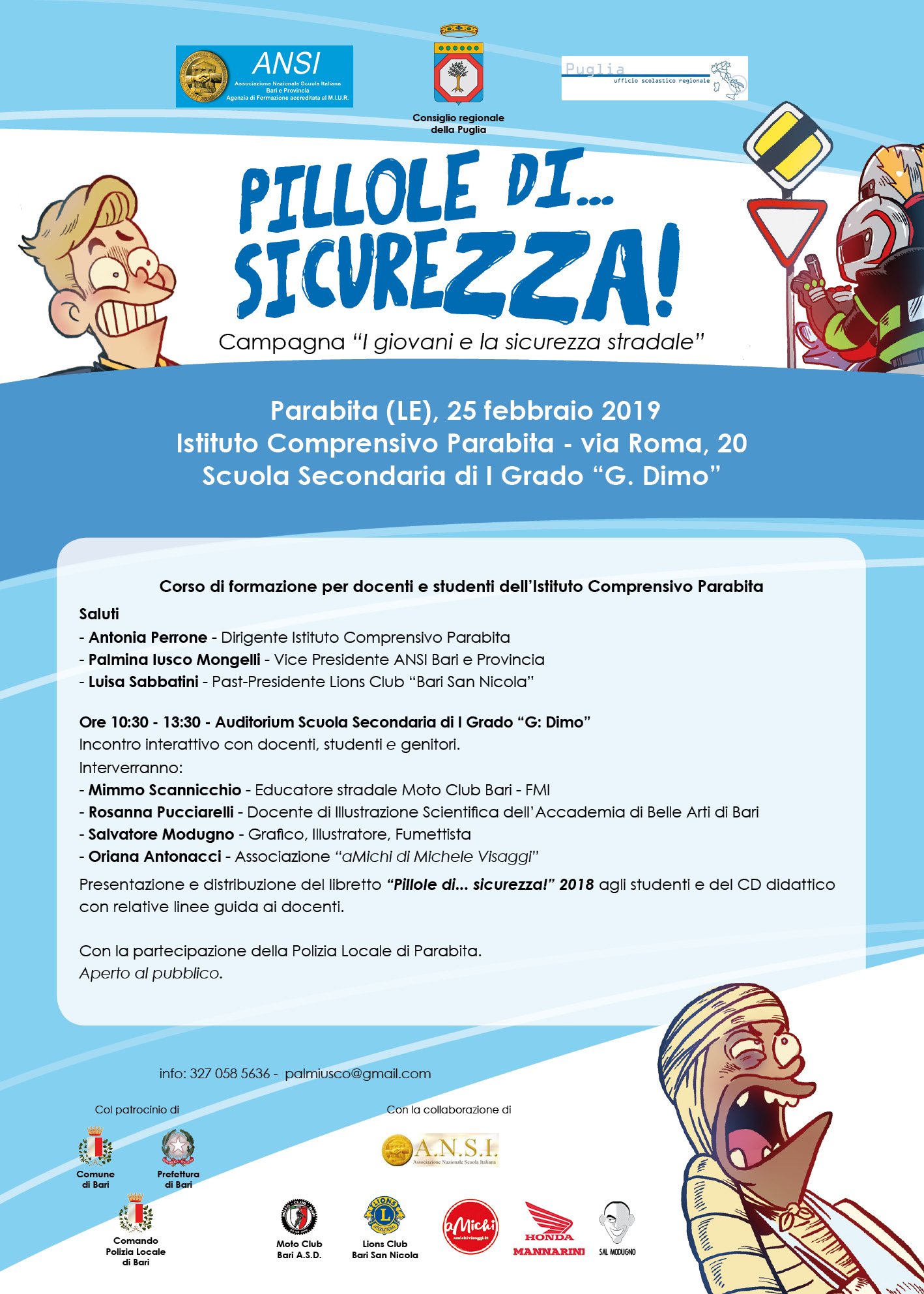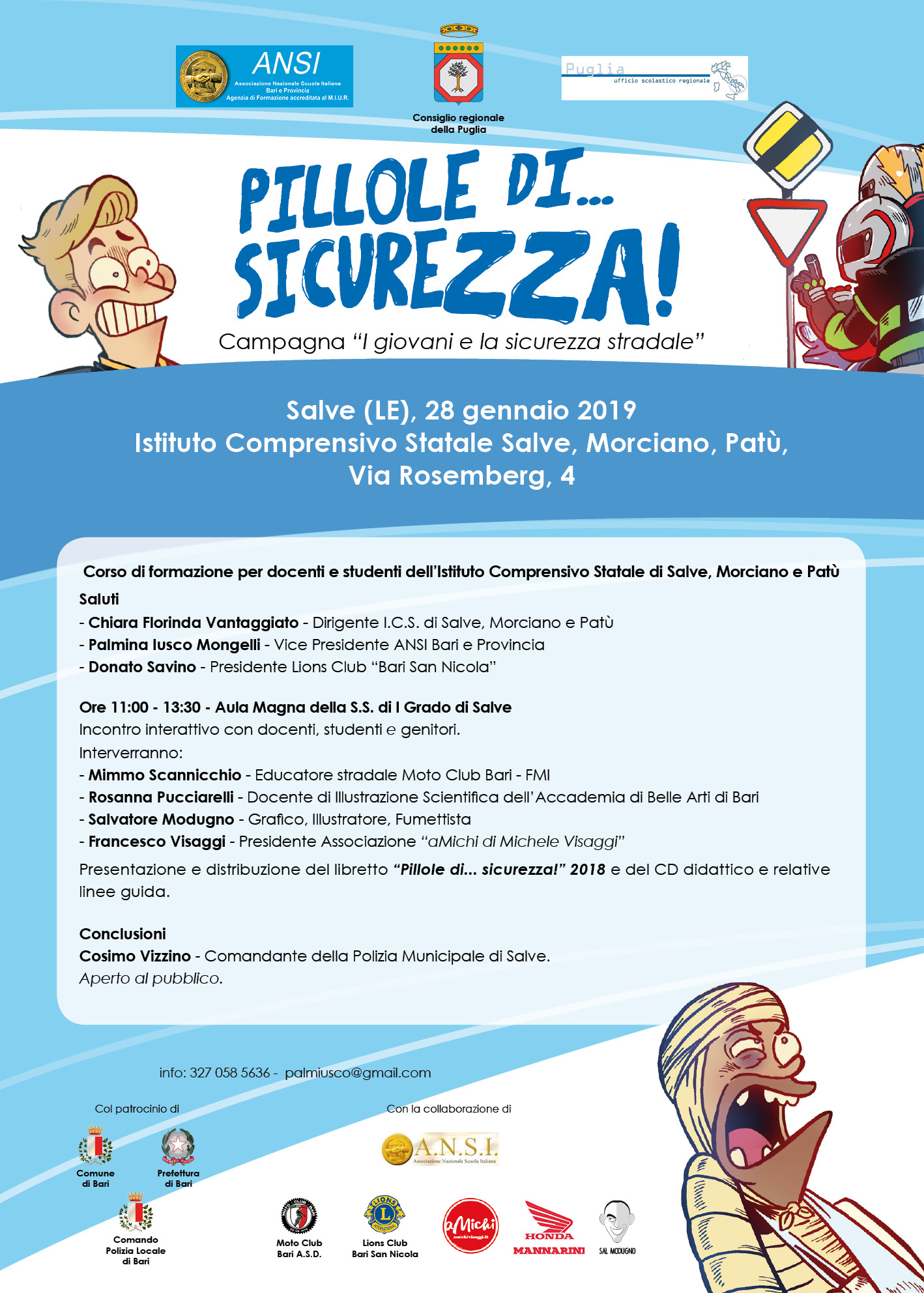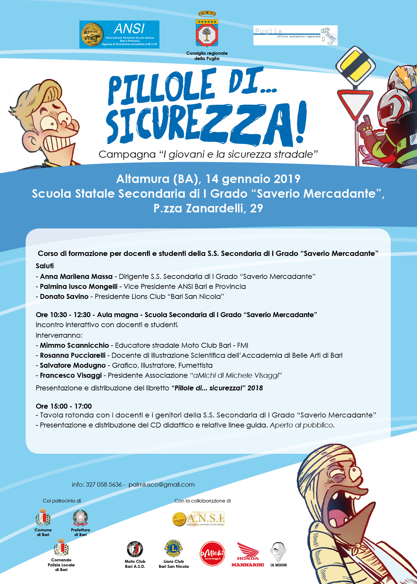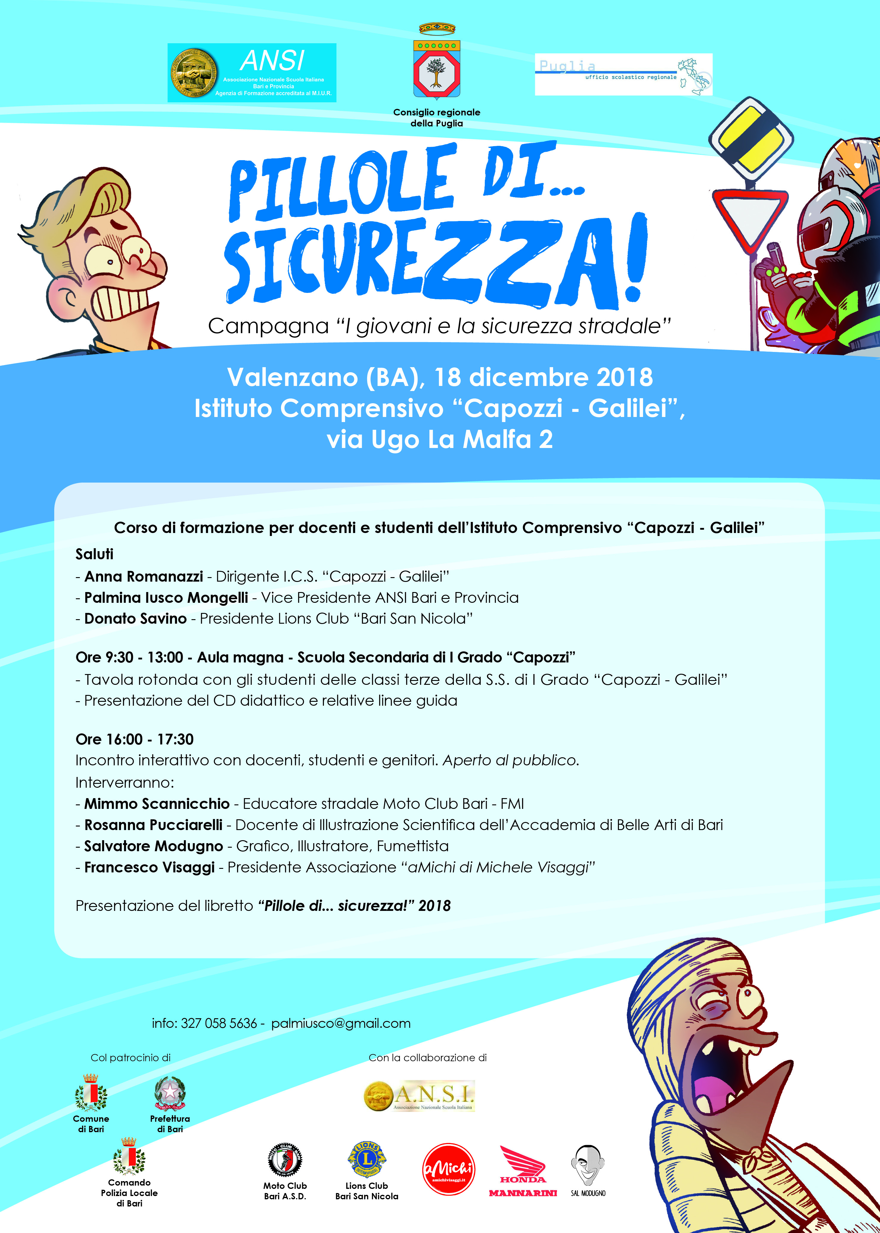 Il Consiglio Regionale della Puglia – Sezione Biblioteca e Comunicazione Istituzionale, accogliendo l’obiettivo lanciato dall’ONU di dimezzare la mortalità stradale entro il 2020, sostiene e promuove il progetto “Pillole di… Sicurezza! Educazione alla sicurezza stradale”, organizzato dall’ANSI-Bari e dall'Ufficio Scolastico Regionale della Puglia, in collaborazione con la Cattedra di Illustrazione scientifica dell’Accademia di Belle Arti di Bari, il Moto Club Bari A.S.D., l’Associazione aMichi di Michele Visaggi, il club Lions Bari San Nicola, il fumettista, illustratore scientifico Salvatore Modugno e il patrocinio del Comune di Bari, della Prefettura di Bari, del Comando della Polizia.