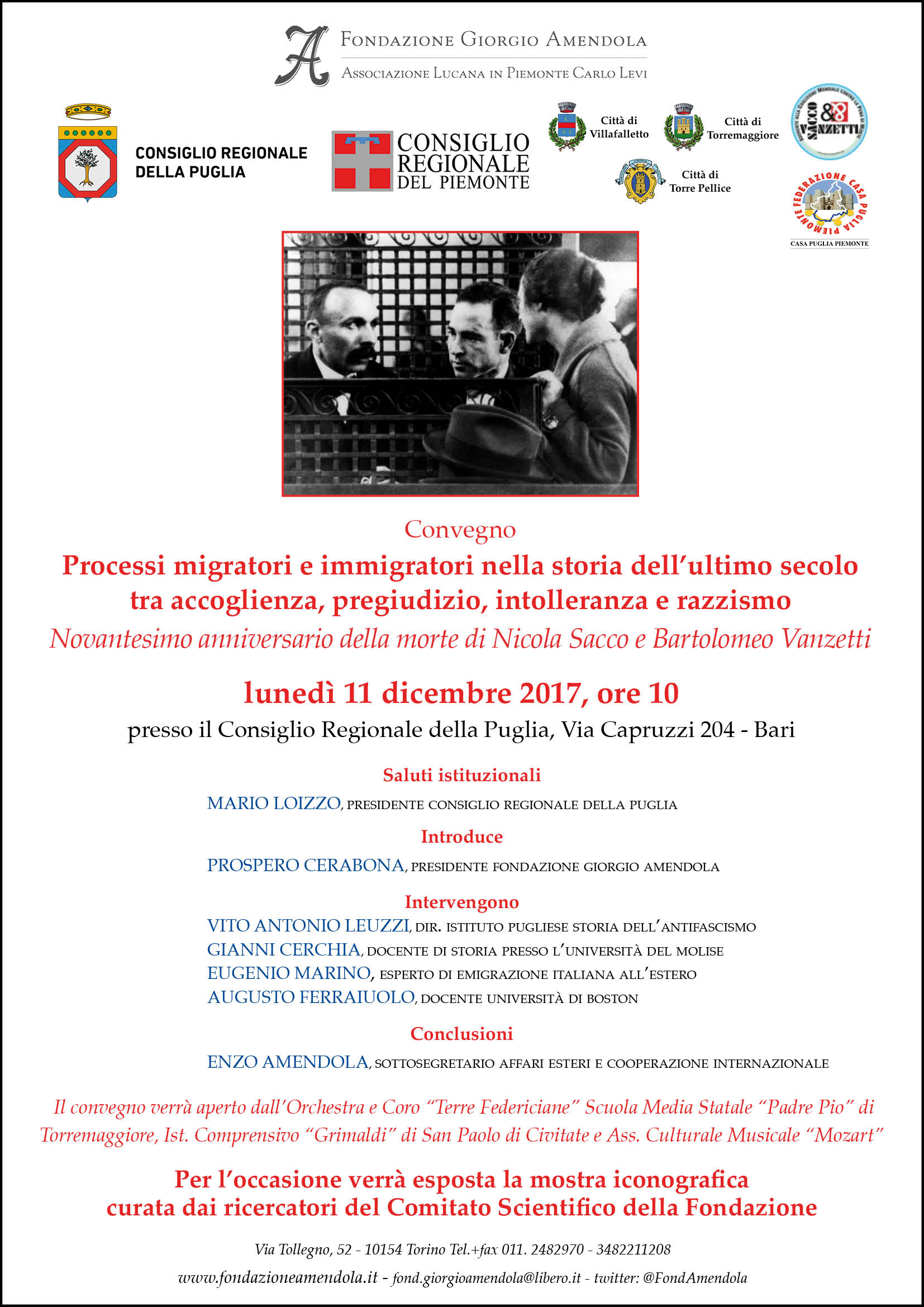 L'11 dicembre 2017, i 'Giovani in Consiglio' hanno partecipato al convegno “Processi migratori e immigratori nella storia dell’ultimo secolo tra accoglienza, pregiudizio, intolleranza e razzismo”, organizzato  dalla Fondazione Amendola di Torino in collaborazione con il Consiglio regionale della Puglia e il Consiglio regionale del Piemonte, in occasione del novantesimo anniversario della morte di Nicola Sacco e Bartolomeo Vanzetti.