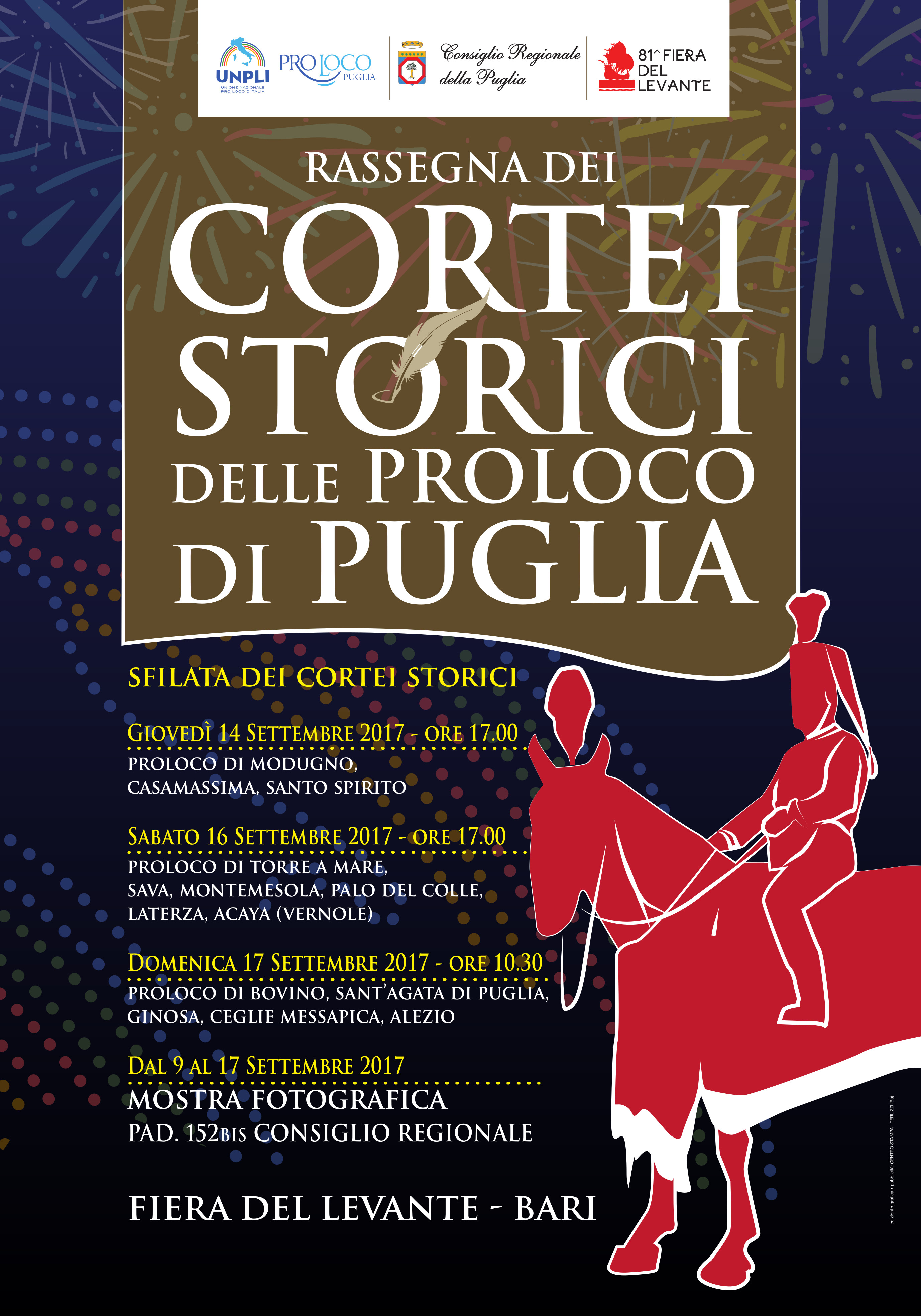 In occasione della 81^ Fiera del Levante, il Consiglio Regionale e UNPLI Puglia hanno voluto promuovere le peculiarità folkloristiche e artistiche dei diversi territori di Puglia, attraverso la rassegna di cortei storici di 14 Pro Loco di Puglia, dal Subappennino dauno al Salento, con l’obiettivo di recuperare e tener sempre desta una tradizione secolare.