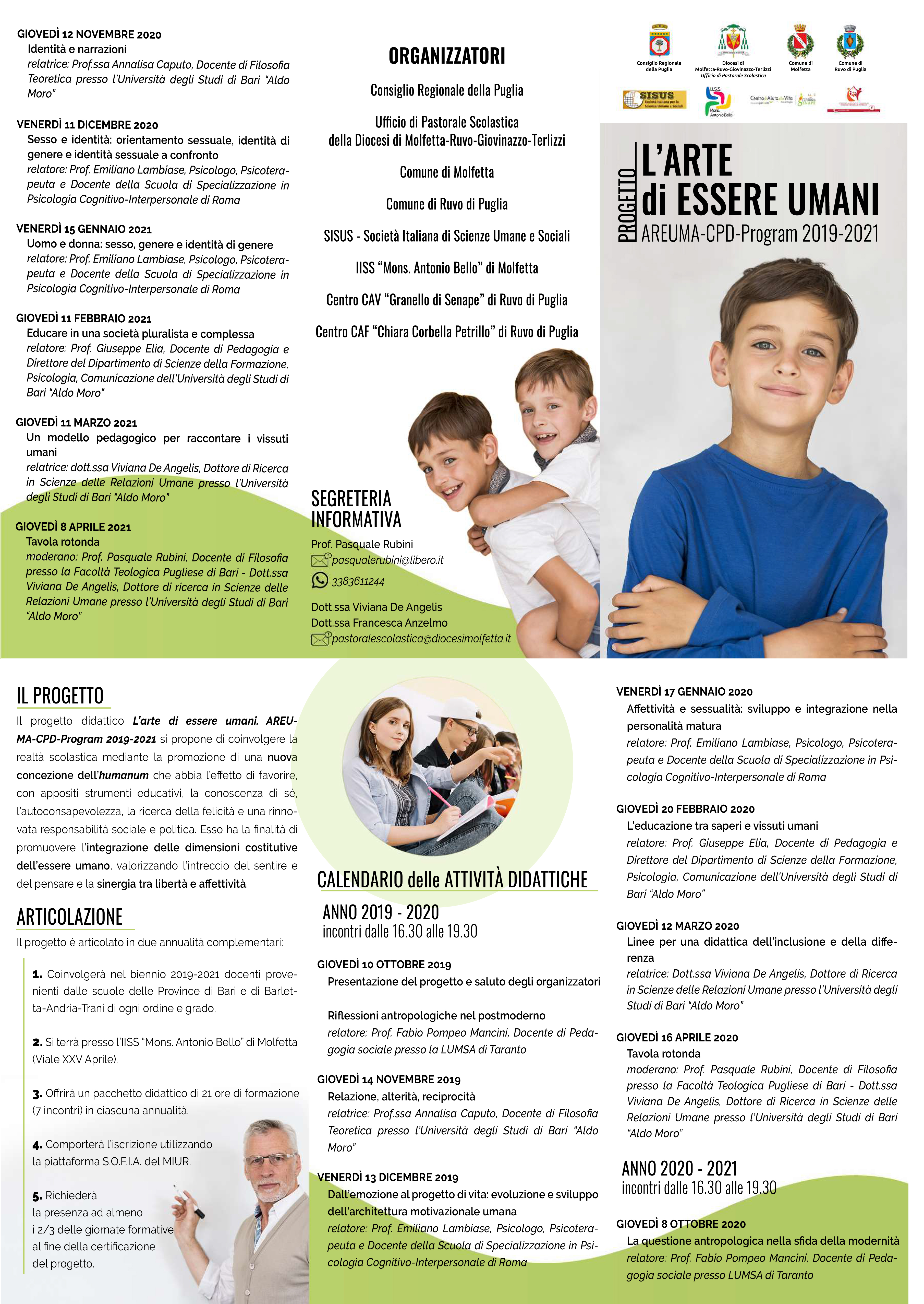 Giovedì 20 febbraio, dalle ore 16,30 alle ore 19.30, c/o l’I.I.S.S. “Mons. Antonio Bello” in Viale XXV Aprile a Molfetta (BA), si svolgerà il quinto incontro del progetto biennale “L’arte di essere Umani – AREUMA – CPD – Program 2019 2021”, dedicato alla formazione di docenti di religione e non solo, organizzato dall’Ufficio di Pastorale Scolastica della Diocesi di Molfetta-Ruvo-Giovinazzo-Terlizzi, con il sostegno del Consiglio Regionale della Puglia, del Comune di Molfetta e del Comune di Ruvo di Puglia, in collaborazione con la SISUS – Società Italiana di Scienze Umane e Sociali, l’IISS “Mons. Antonio Bello” di Molfetta, il Centro CAV “Granello di Senape” di Ruvo di Puglia e il Centro CAF “Chiara Corbella Petrillo” di Ruvo di Puglia.