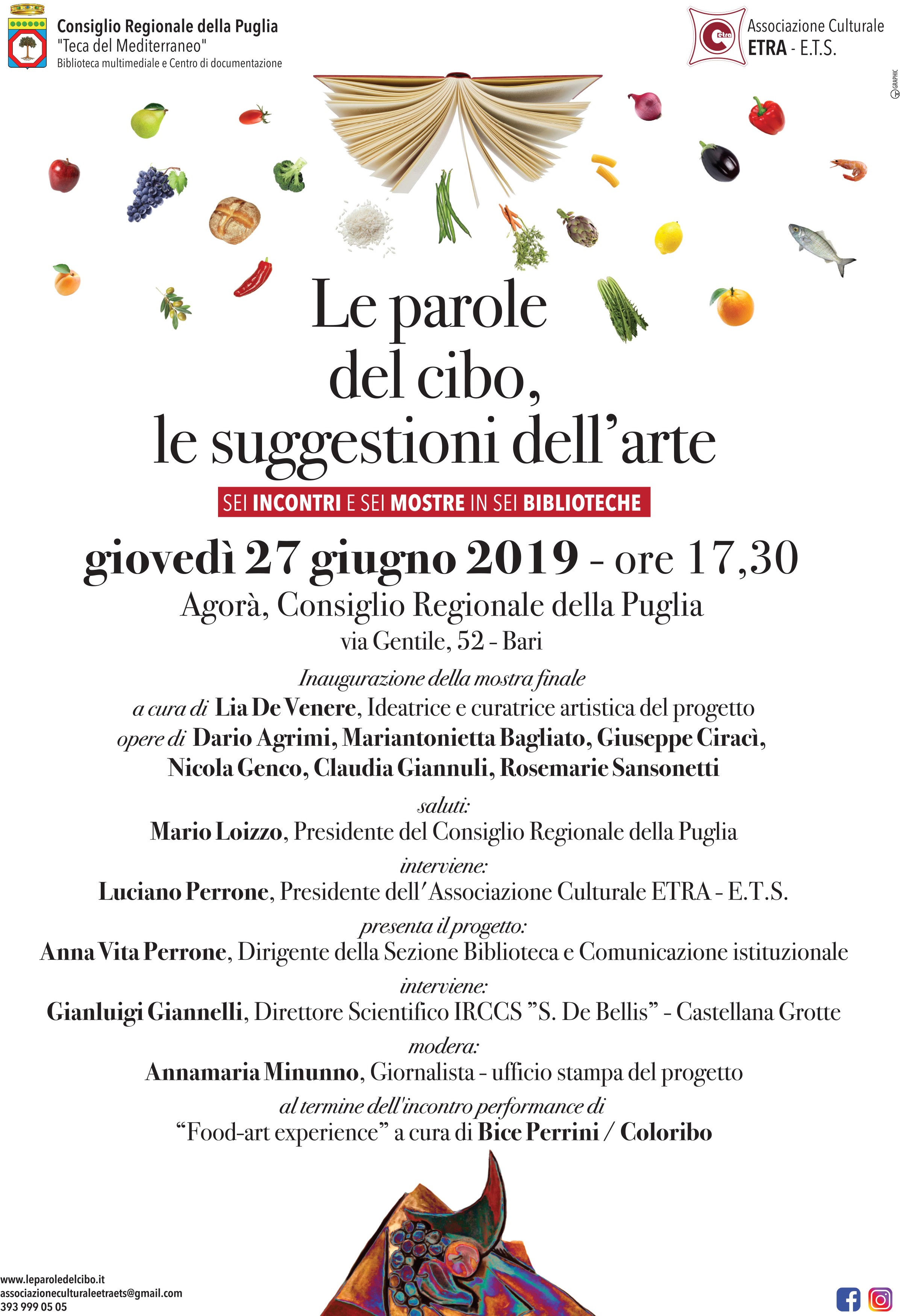 Il progetto “Le parole del cibo, le suggestioni dell’arte” si è concluso in Consiglio regionale, nell’agorà del palazzo di vetro, il 27 giugno 2019 con l'inaugurazione della mostra dei sei artisti pugliesi e la presentazione del catalogo.