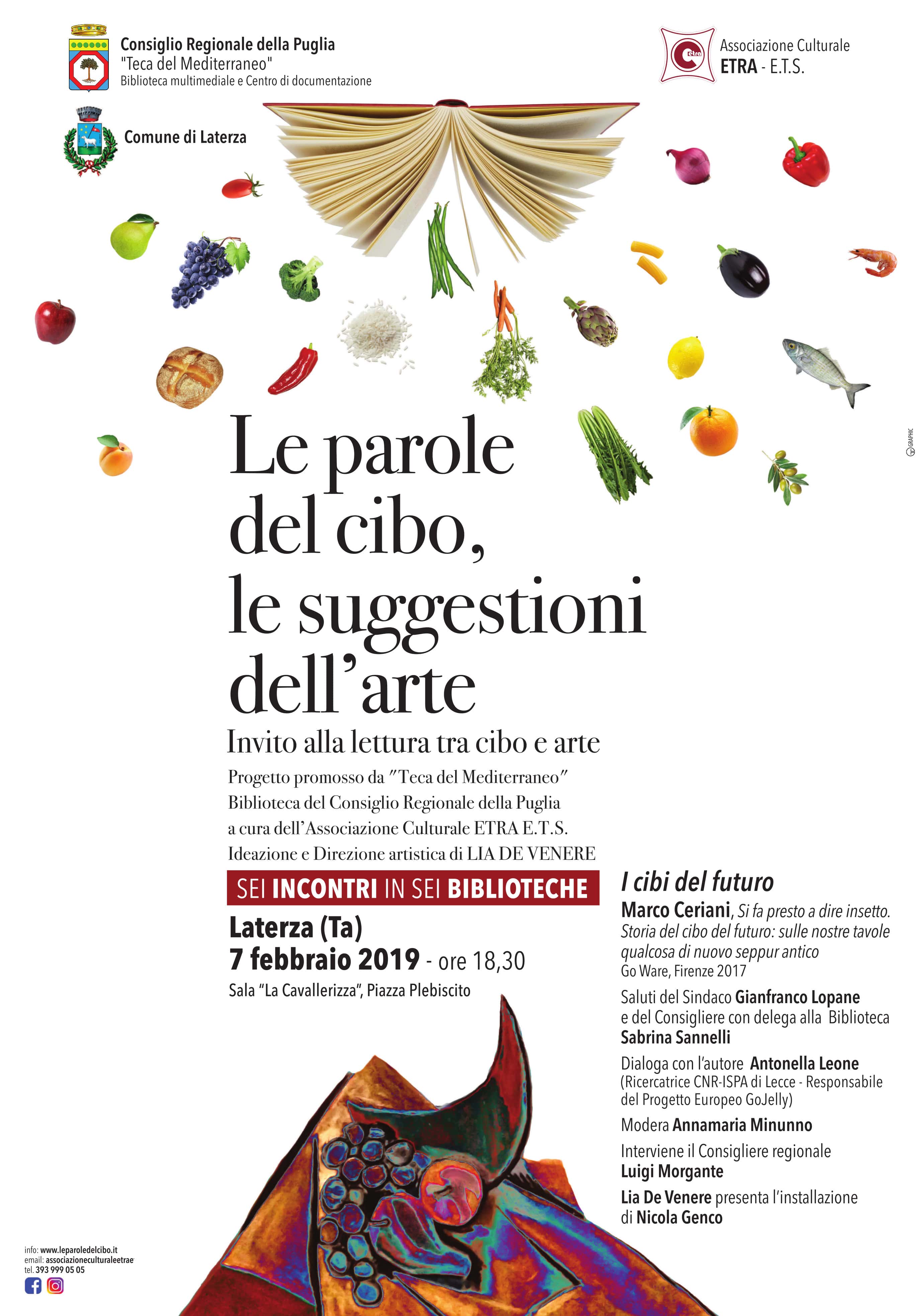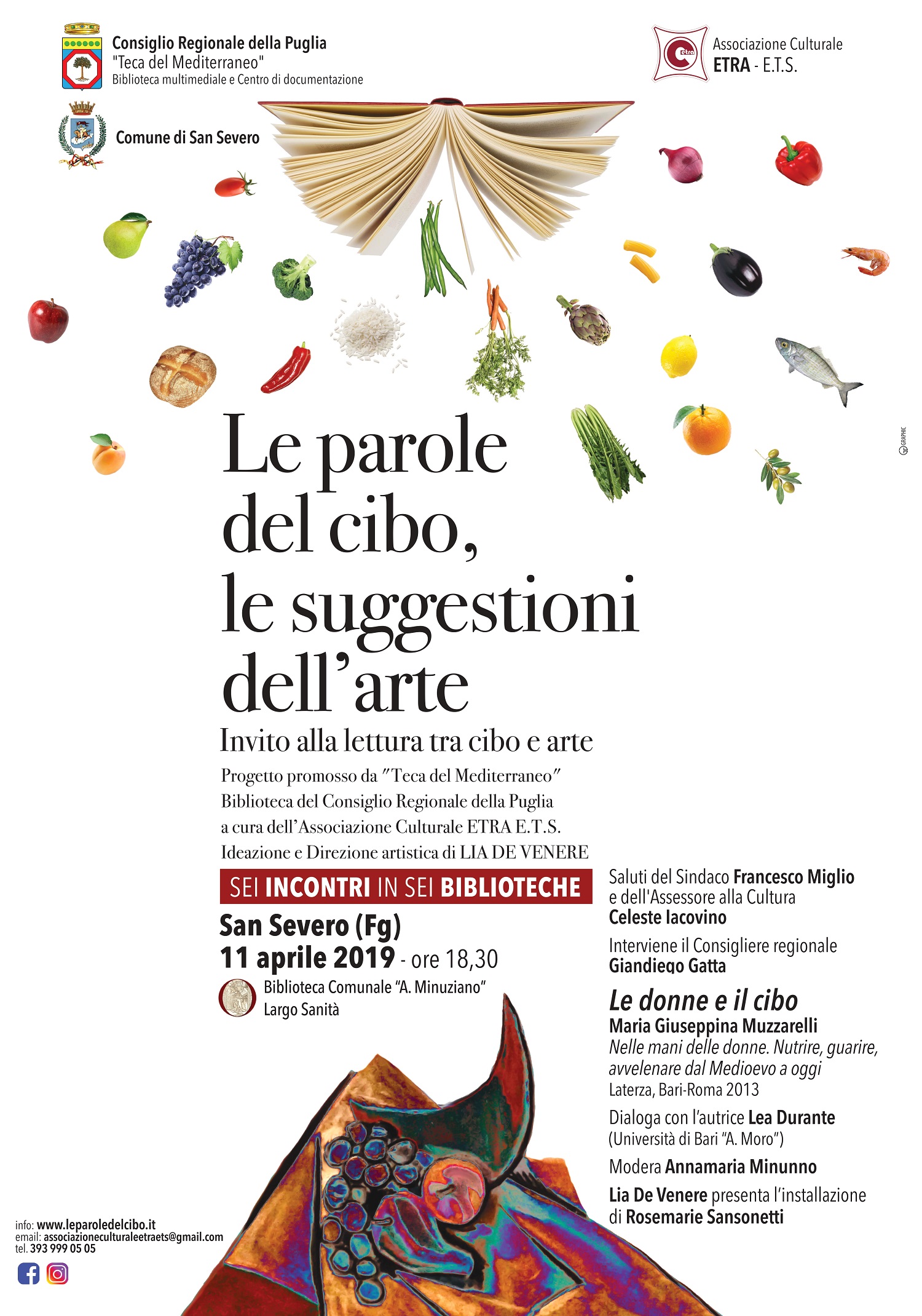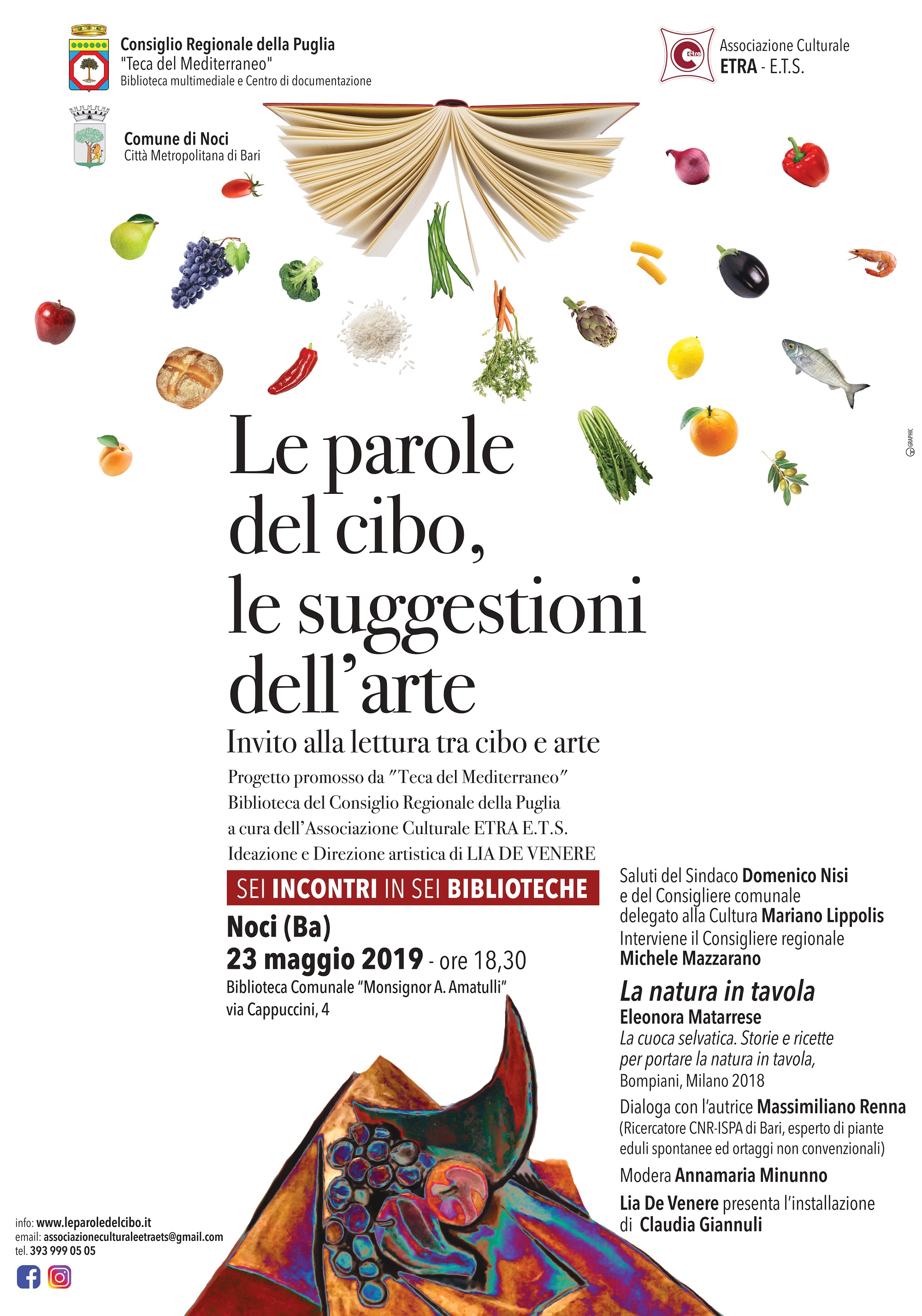 Sono state coinvolte sei biblioteche pugliesi, una per ogni provincia, in altrettanti incontri con la presentazione di libri e di installazioni di artisti contemporanei pugliesi (Nicola Genco, Dario Agrimi, Rosemarie Sansonetti, Giuseppe Ciracì, Claudia Giannuli, Mariantonietta Bagliato) legati al tema del cibo, oltre all’intervento di ricercatori ed esperti.