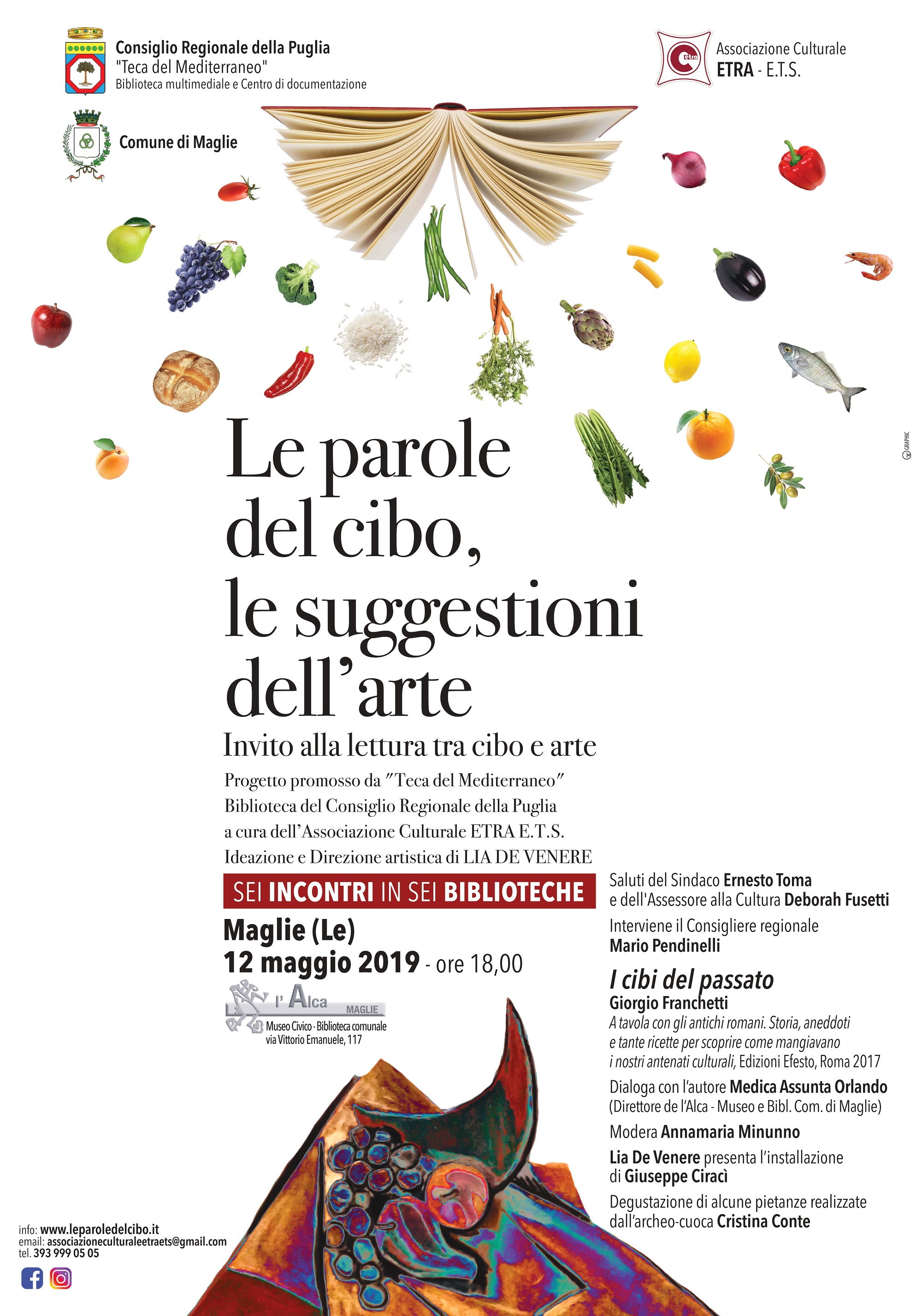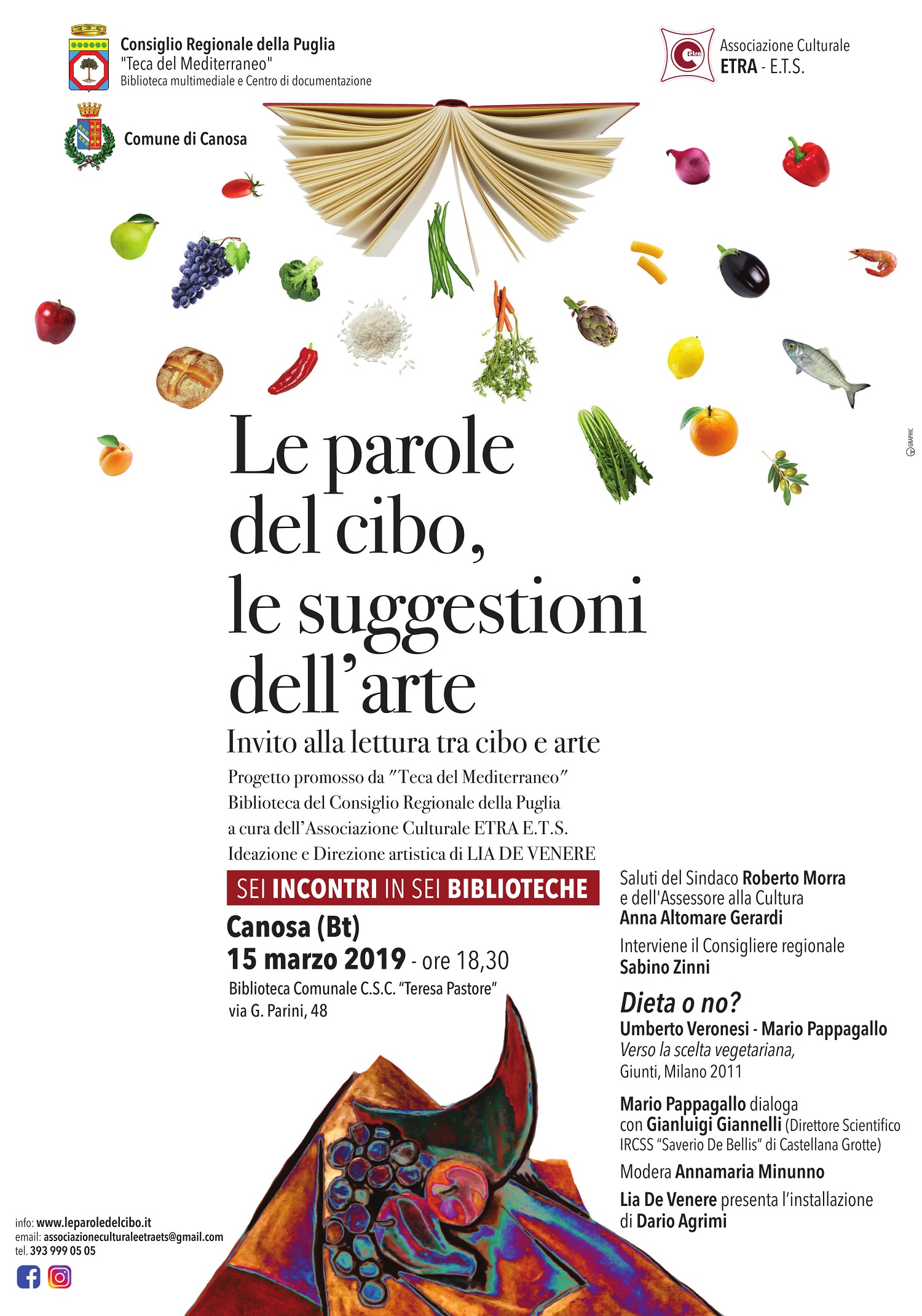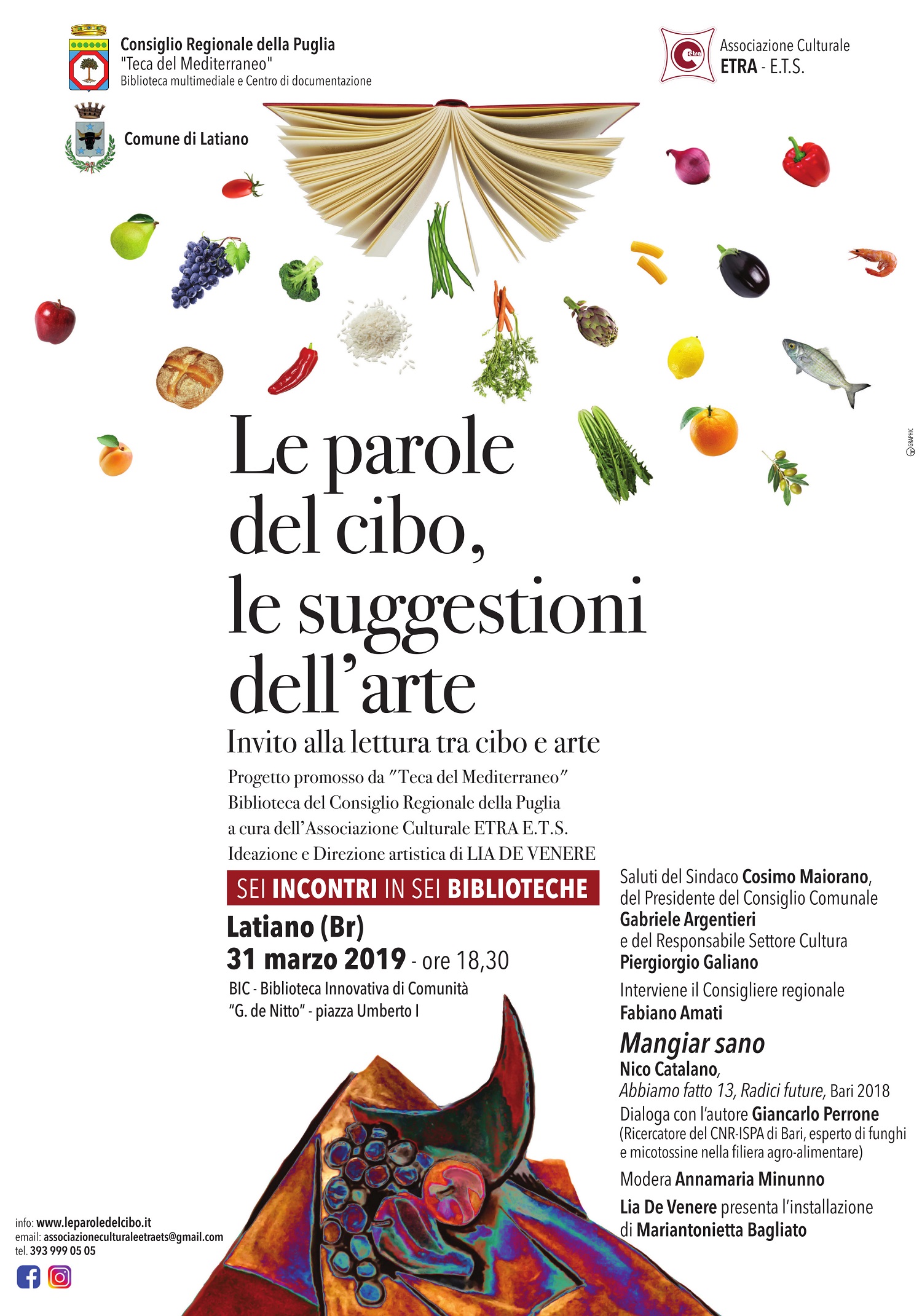 Sono state coinvolte sei biblioteche pugliesi, una per ogni provincia, in altrettanti incontri con la presentazione di libri e di installazioni di artisti contemporanei pugliesi (Nicola Genco, Dario Agrimi, Rosemarie Sansonetti, Giuseppe Ciracì, Claudia Giannuli, Mariantonietta Bagliato) legati al tema del cibo, oltre all’intervento di ricercatori ed esperti.